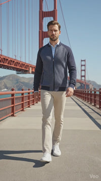 Discover timeless elegance with this luxurious bomber jacket, reimagined through a contemporary lens. Blending baby wool, yak, and cashmere in a sophisticated proportion, this piece showcases a dynamic diamond stitch pattern with sporty appeal. The double-knitted construction using twisted yarns ensures exceptional durability and structure, while genuine leather trims and striped ribbed detailing elevate the design. Perfect for layering through winter months, the ribbed cuffs and hem provide a refined finish that transitions effortlessly from casual to polished settings.