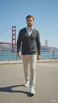 This pure cashmere cardigan exemplifies versatile sophistication through its timeless cable-knit construction and refined detailing. Crafted from 100% cashmere in twisted double yarns, it delivers exceptional softness and durability while the distinctive cable design adds visual interest without compromising elegance. Real horn buttons, ribbed cuffs, and hem provide authentic finishing touches. Whether layered over a polo for relaxed styling or paired with a dress shirt for professional settings, this piece adapts seamlessly across occasions and seasons.