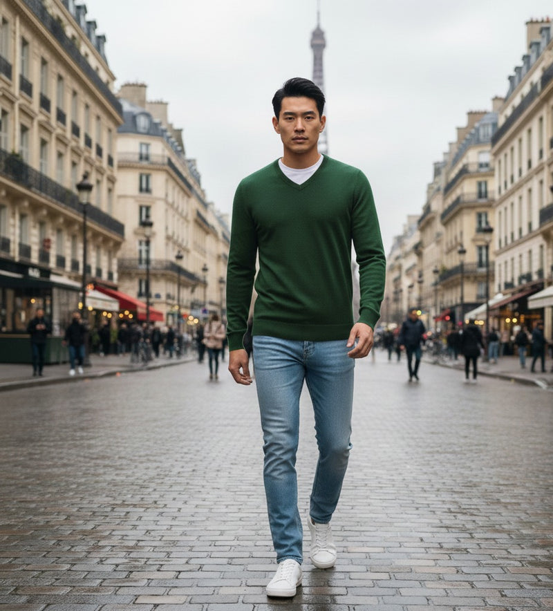 Cedak Green Men´s Cashmere V Neck Sweater with contrast - Hommard