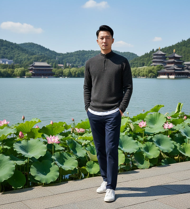 Cashmere Sweater black Button Neck Bodalla in pique Stitch
