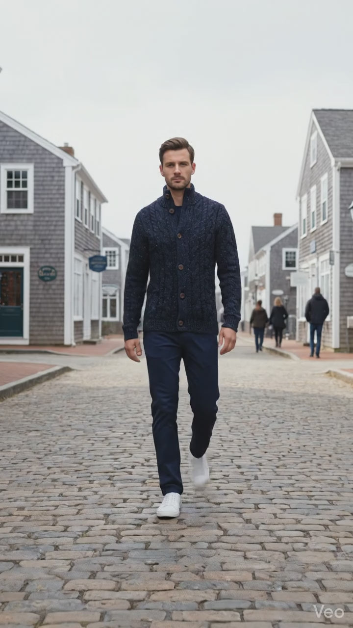 Crafted from 100% pure cashmere, this Donegal Cable Cardigan exemplifies refined versatility. The distinctive cable knit pattern, enhanced by twisted Donegal yarns, creates visual depth and textural interest. Ribbed detailing at the cuffs and hem ensures a polished fit. Whether layered over essentials for transitional weather or worn as a standalone piece, this cardigan seamlessly transitions across seasons and occasions, offering both sophistication and practical warmth.