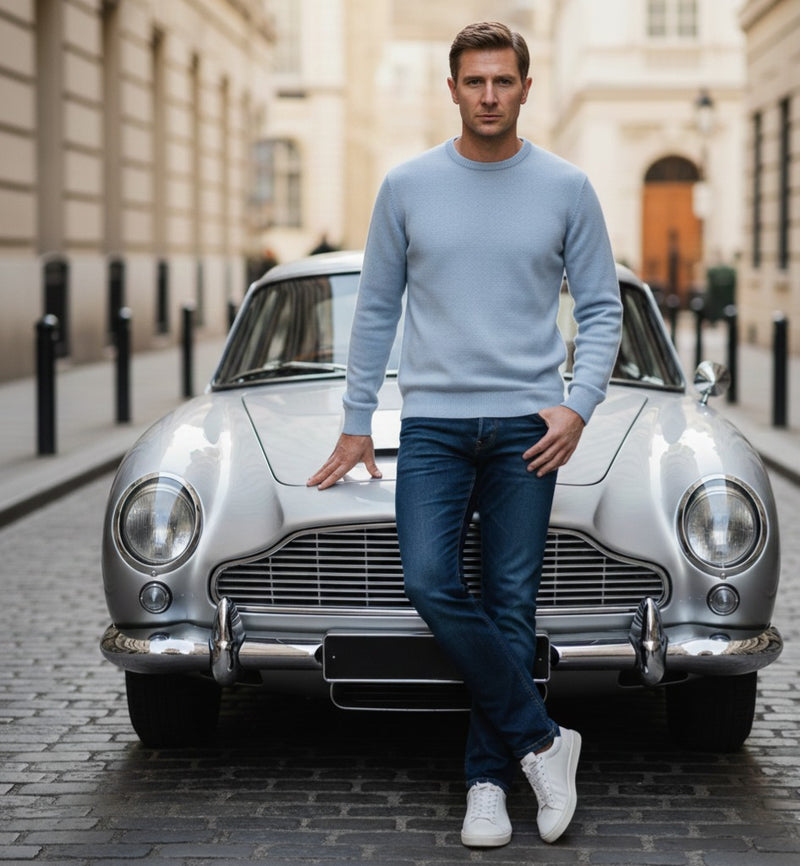 Blue Cashmere Crewneck Sweater in heavy seed stitch knit Vence